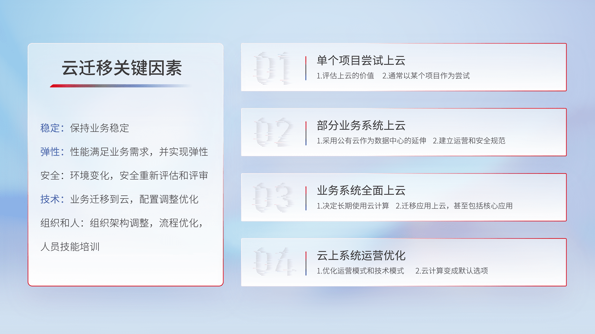 结合实际业务,,,从规划设计、、云平台选型、、、、云原生改造、、、、数据迁移、、、、集成交付,,迁移全过程为客户识别最佳上云路径,,,做好风险识别管理,,,,设计网络架构、、、身份权限、、安全审计合规、、、、操作审计、、、日志审计、、、、监控告警策略、、、多站点容灾设计等,,,对云上基础设施进行整体规划,,提升IT治理水平,,,,以满足弹性、、、、高可用、、、高性能的需求。。。