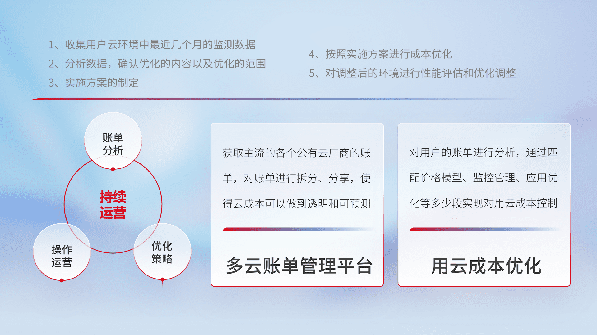 通过多云纳管,,,以统一的资源数据模型把客户的云资源进行抽象和封装,,,,进而实现对多云资源的统一操作,,,,保障云资源管理的可靠性、、、、稳定性与可用性。。。。量身定制化运维内容,,,,配置、、、开发运维、、、、补丁管理、、、、备份、、、、监控、、、、认证和访问管理、、、审计和日常巡检等,,保障在用云过程中的可靠度,,稳定度以及高可用率。。。。